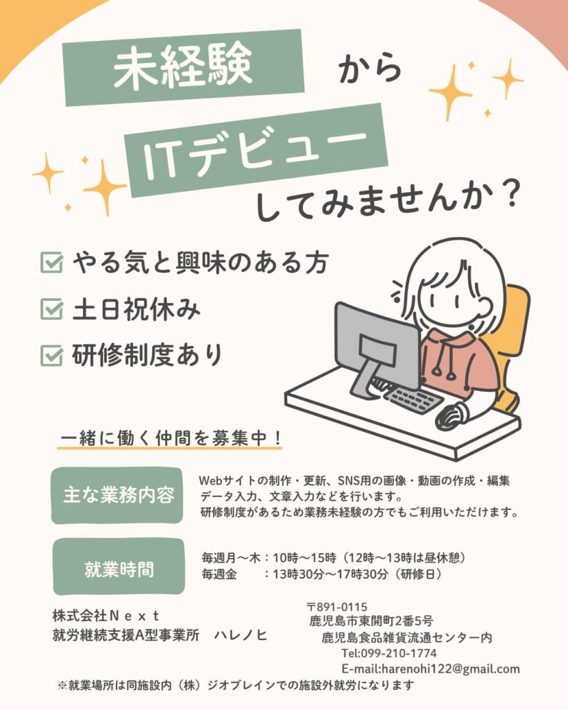 当事業所は令和7年11月28日より(株)ジオブレイン様と請負契約を締結いたしまして、施設外就労を行うことになりました。施設外就労実施に伴いまして、一緒に働いてくださる利用者さんを募集しております。毎週金曜日の13時30分~17時30分に研修を概ね6か月間行います。就労場所は当事業所の2Fになります。お問い合わせはハレノヒまでお願いします。